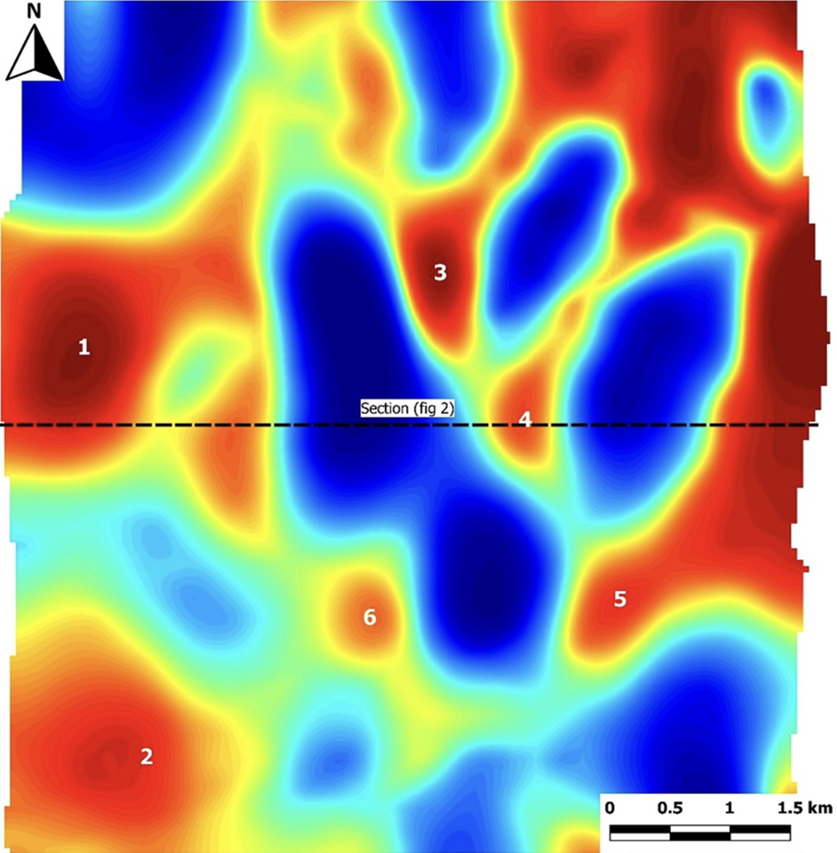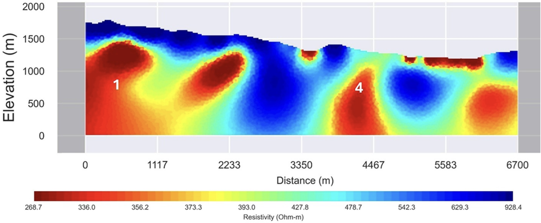 MobileMT ist die aktuell fortschrittlichste Generation der luftgestützten Audiofrequenz-Magnetik (‚AFMAG‘)-Technologie und das einzige System, das nachweislich geoelektrische Informationen von der Oberflächennähe bis zu einer Tiefe von mehr als 1 km mit hoher räumlicher Auflösung liefert. Wie eindrucksvoll ‚MobileMT‘ das Power-Potenzial der sechs leitfähigen Anomalien von ‚Awacha‘ dokumentiert hat, zeigt der Tiefenschnitt im vielversprechenden Zielgebiet. Dabei steht die rote Farbe für hohe Leitfähigkeit, die blaue Farbe für hohen Widerstand.