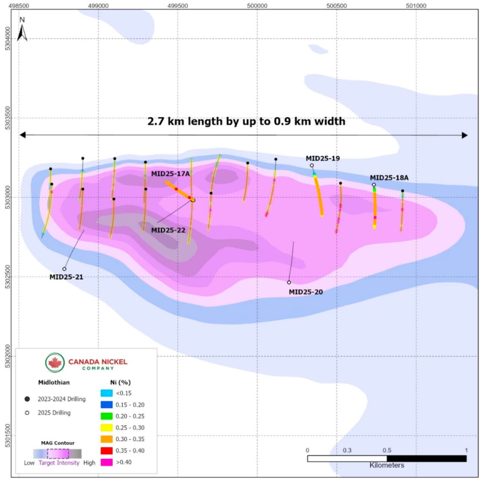 Diese jüngsten Bohrungen haben den bekannten nickelhaltigen Körper in ‚Midlothian‘ in Richtung Süden um bis zu 300 m vergrößert. Das geophysikalische Ziel misst insgesamt etwa 2,7 km in der Länge und 0,4 bis 0,9 km in der Breite – ein Fußabdruck von rund 1,7 km² und damit sogar schon etwas größer als ‚Crawford‘ (1,5 km²).