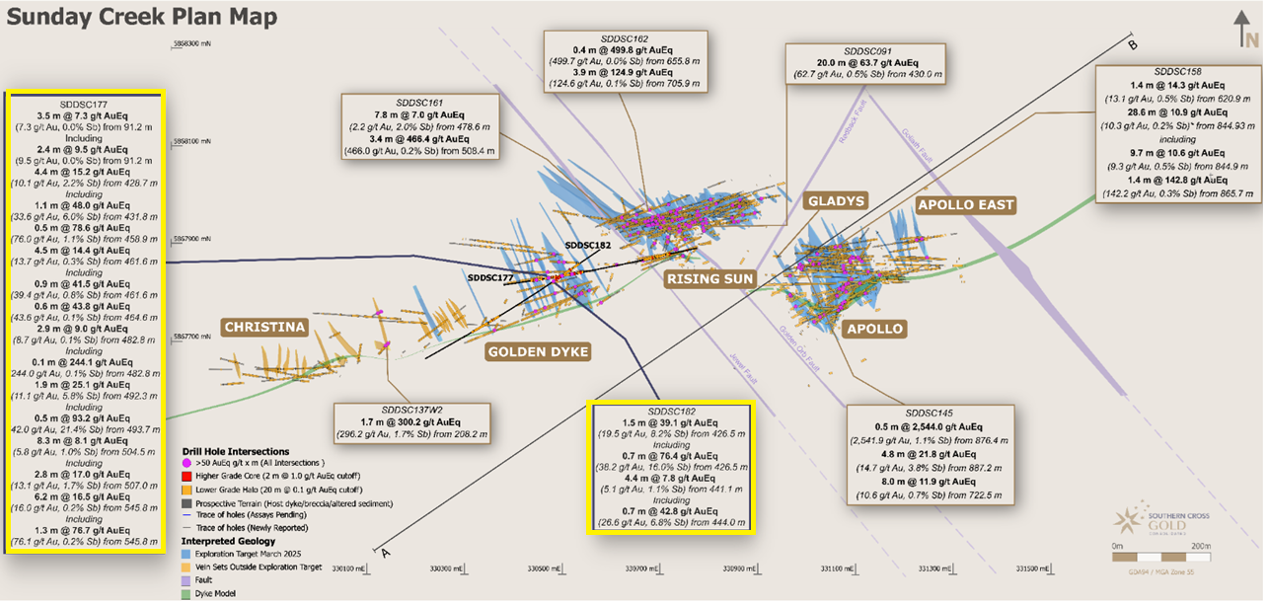 SDDSC177 setzte mit 3,0 g/t Goldäquivalent AuÄq (2,35 g/t Gold, Au, 0,26 % Stibnit, Sb) über 168 m eine neue Benchmark für künftige Bohrungen und lieferte mit
