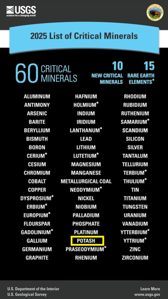 Am 7. November 2025 hat das US-Innenministerium die finale Version seiner 2025 ‚List of Critical Minerals‘veröffentlicht. Unter den 60 aufgeführten Rohstoffen befindet sich auch ‚Potash‘.