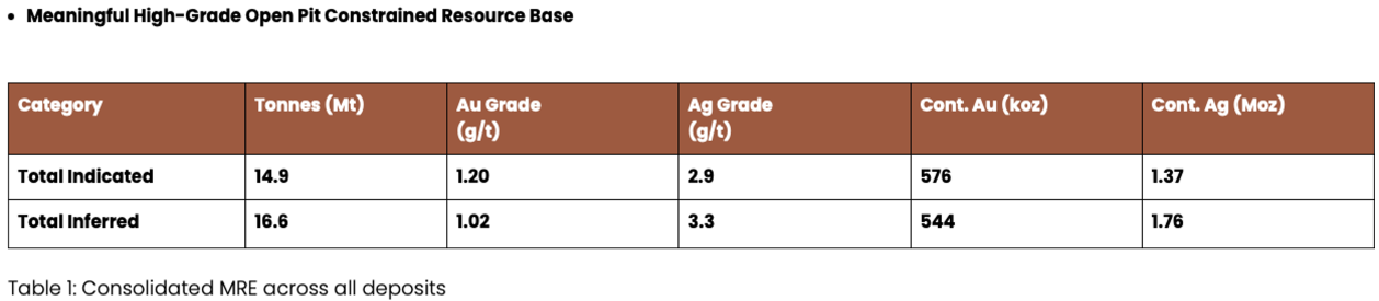 Das Projekt verfügt über eine definierte Ressource von mehr als 1,1 Mio. Unzen Gold (ca. 576.000 oz ‚Indicated‘ und ca. 544.000 oz ‚Inferred‘) NI 43-101-konform und ‚open-pit‘-konzipiert. Zudem ist schon eine erprobte ‚Heap-Leach‘-Metallurgie mit Goldausbringungsraten von rund 80 bis 90 %in der Oxidzone nachgewiesen, sowie eine funktionierende Betriebs-Infrastruktur, und potenziell kostengünstiger Produktion, bereits in einer ersten Phase.