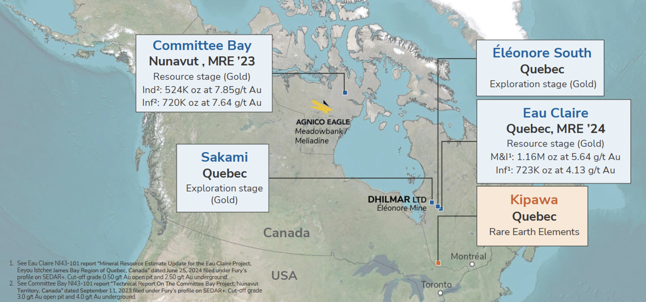Kipawa & Zeus Seltenerdmetall-Projekte (Québec): Die Kipawa- (68 % Fury / 32 % Investissement Québec) und Zeus-Projekte (100 % Fury) umfassen gemeinsam rund 43 km² im Süden der Provinz Québec. Beide liegen in einer Region mit guter Infrastruktur und Zugangsmöglichkeiten. Das Kipawa-Projekt beherbergt historische Reserven von 19,8 Mio. Tonnen mit 0,0411 % Gesamt-Seltenerdoxid (TREO), insbesondere mit den strategisch wichtigen Elementen Terbium (Tb) und Dysprosium (Dy). Die Mineralisierung tritt an der Oberfläche auf und ist tagebaufähig, was eine potenziell kostengünstige Förderung ermöglicht. Das Projekt liegt zudem in einem syenitischen Komplex, der für seine hohe Konzentration seltener Erden bekannt ist!