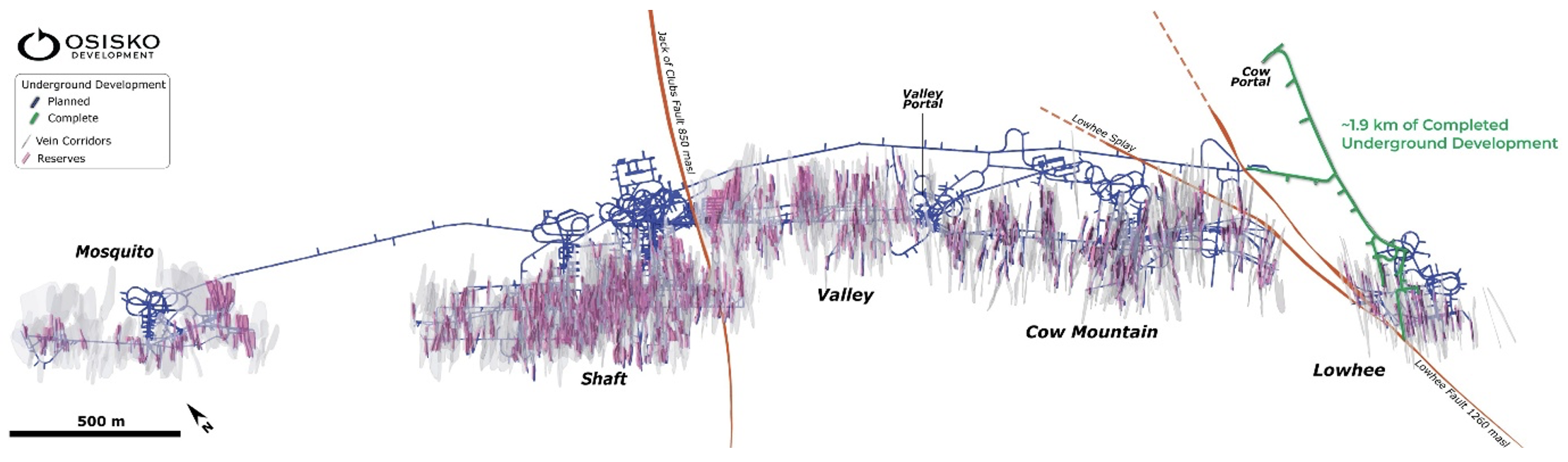 So konnten unter anderem bereits etwa 1,9 km vom bestehenden ‚Cow‘-Portal in die ‚Lowhee‘-Zone und entlang der Hauptzugangsrampe in Richtung ‚Cow Mountain‘-Zone bis zur ‚Lowhee‘-Verwerfung erschlossen werden.