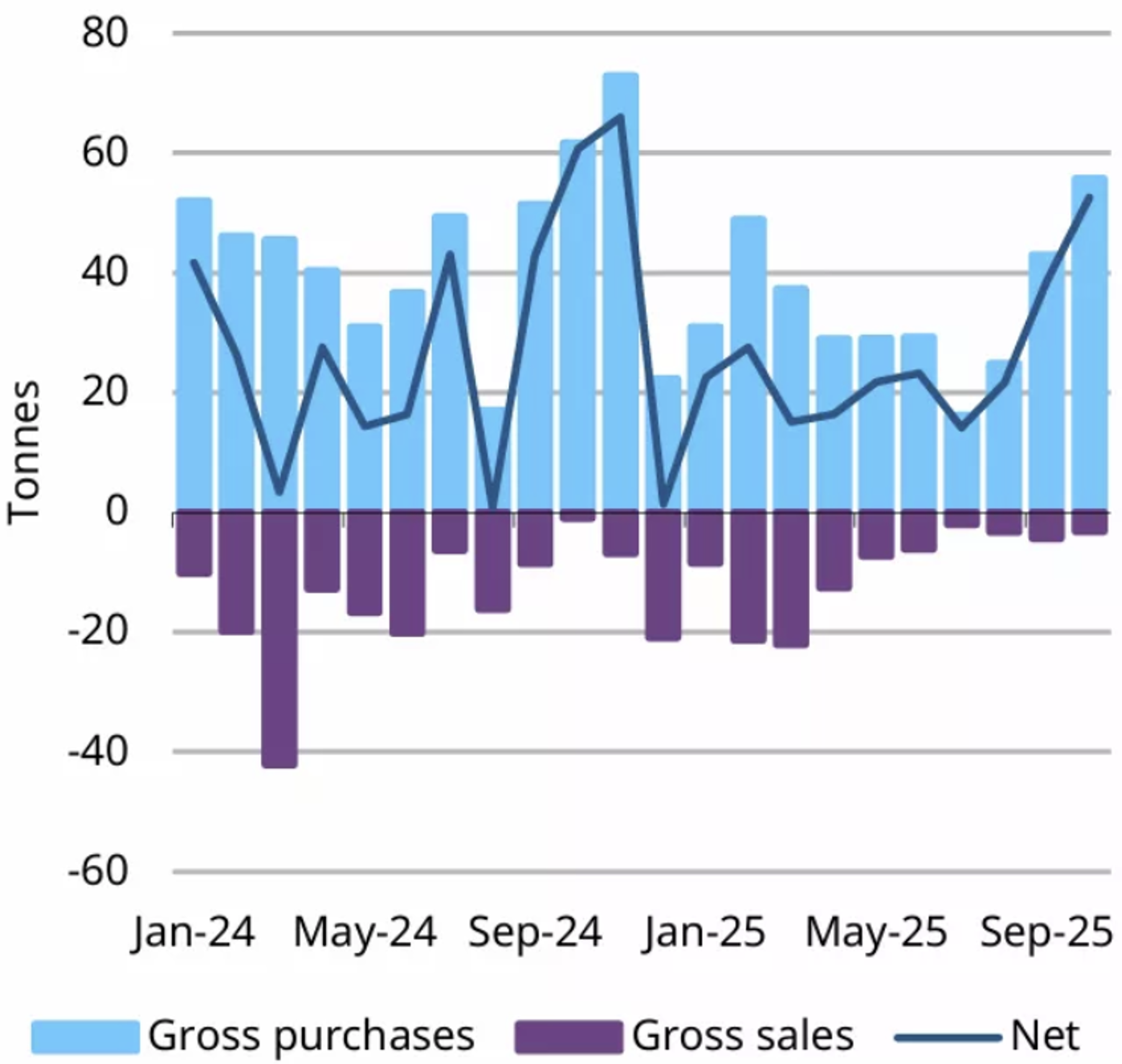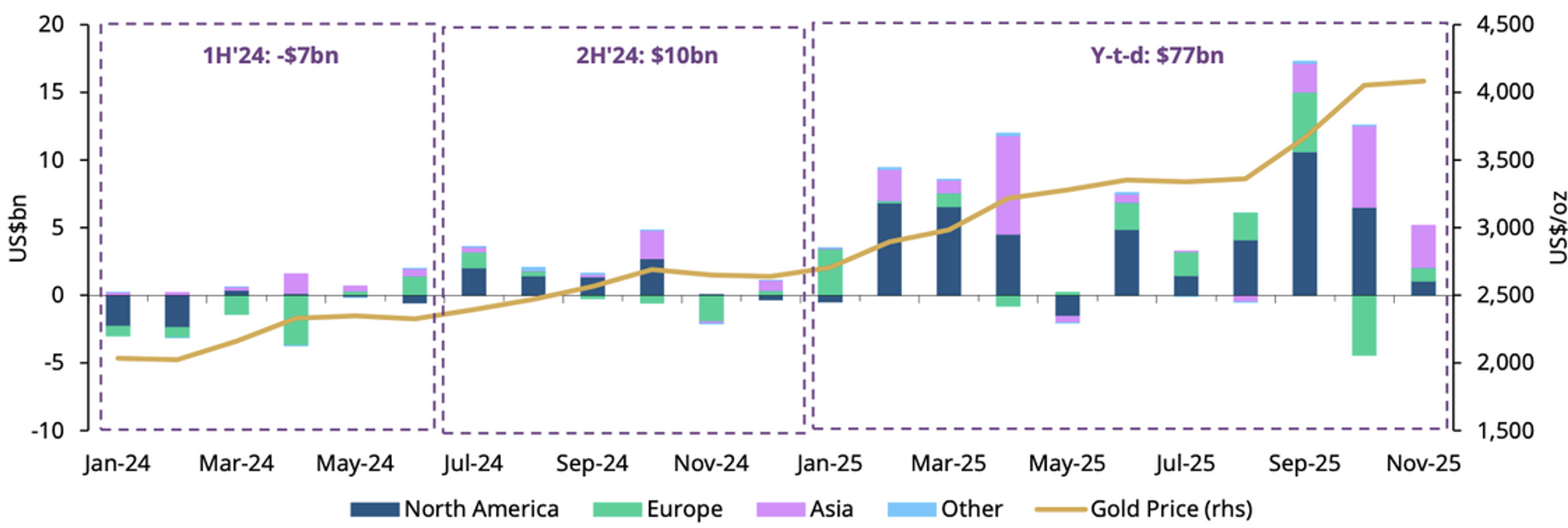 die Gold-ETFs verzeichnen Rekordzuflüsse, mit 5,2 Mrd. USD im November und einem Rekordbestand von 3.932 Tonnen. Das ist ganz nebenbei der höchste jemals zu Monatsende verzeichnete Zufluss. Tonangebend waren dabei die asiatischen Investoren.