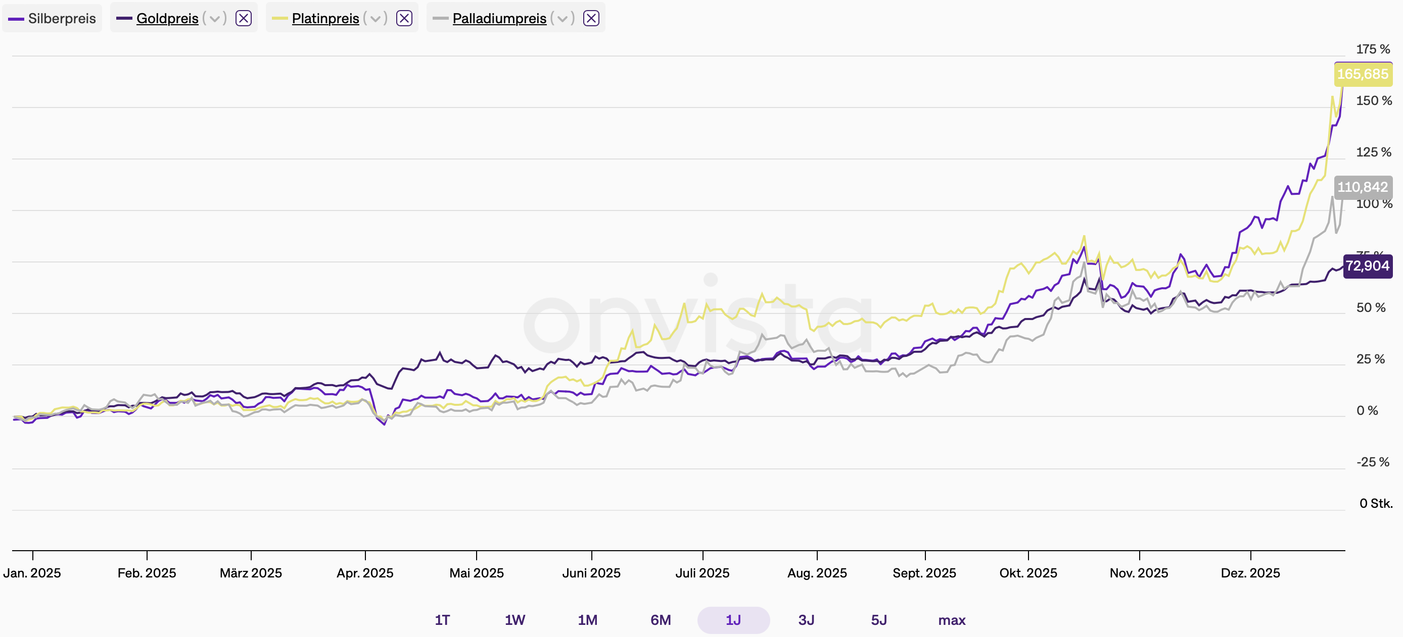 Gold notiert nahe am Rekordhoch von Ende Oktober. Silber glänzt mit rund 67 US-Dollar je Unze. Auch Platin und Palladium haben sich deutlich verteuert.