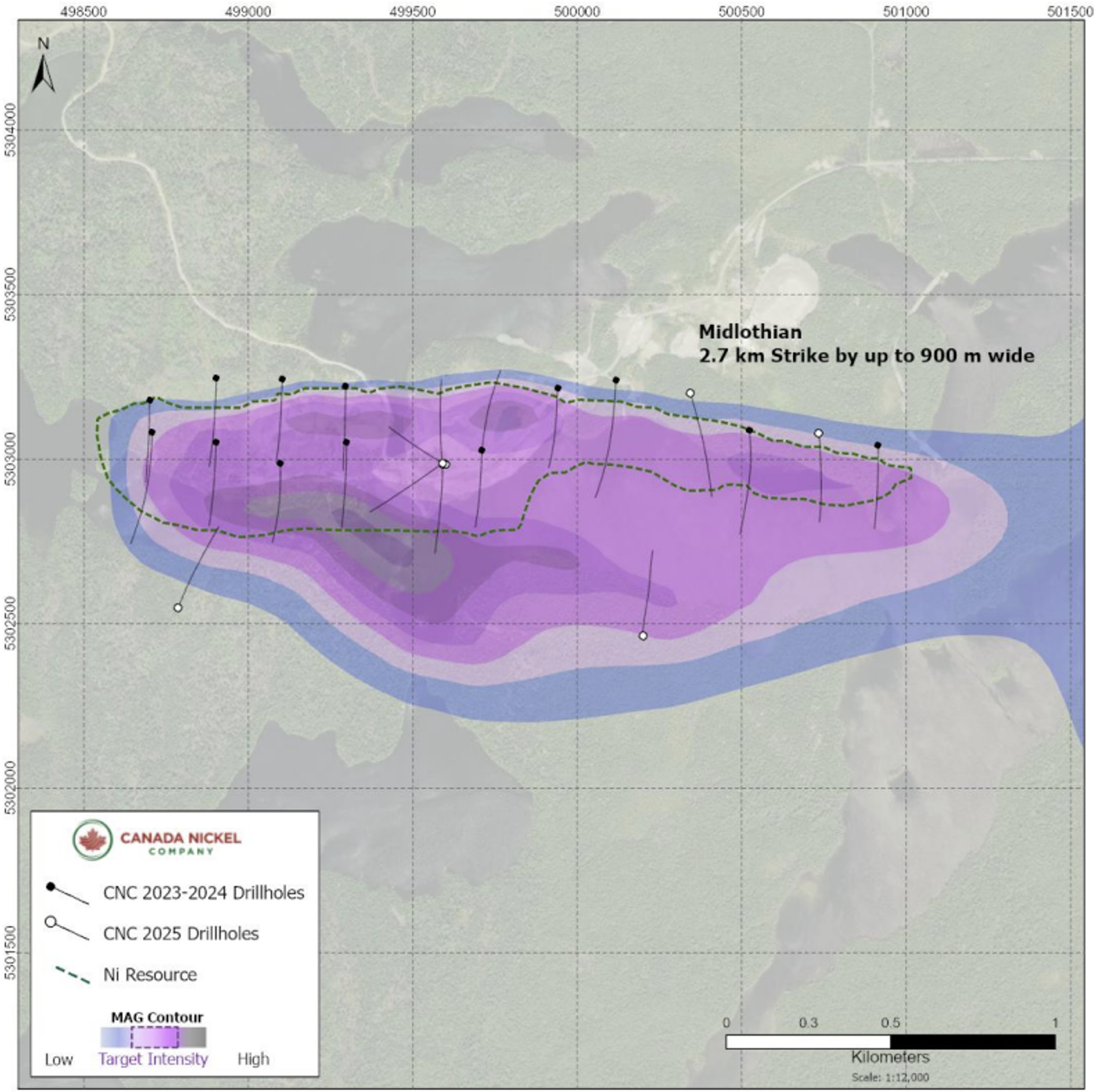 Das Midlothian-Projekt von Canada Nickel (WKN: A2P0XC) befindet sich rund 110 Kilometer südlich des unternehmenseigenen Flaggschiffprojekts Crawford sowie etwa 27 Kilometer südwestlich der Bergbaustadt Matachewan in Ontario und ist ganzjährig gut zugänglich. Die erste Mineralressourcenschätzung (MRE) basiert auf 9.268 m Kernbohrungen aus 22 Bohrlöchern, die im Zeitraum von 2023 bis 2025 durchgeführt wurden, und deckt rund 45 % des identifizierten geophysikalischen Zielgebiets ab.
