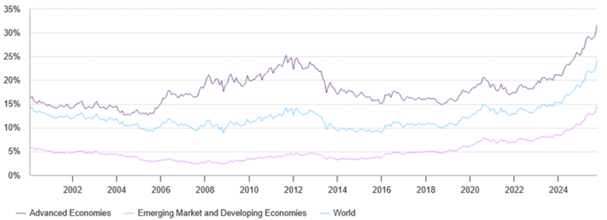 Gold als Anteil an den gesamten Devisenreserven der Industrienationen und der Schwellen- und Entwicklungsländer im Vergleich: