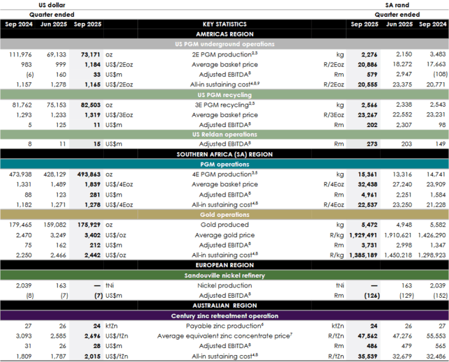 So legte die 4E PGM-Produktion in Sibanye-Stillwater (WKN: A2PWVQ) südafrikanischen Betrieben gegenüber dem zweiten Quartal 2025 um satte fast 70.000 Unzen zu und erreichte bis Ende September fette rund 494.000 Unzen zu einem durchschnittlichen Korbpreis von 1.839,- USD/4E Unze gegenüber 1.489,- USD in Q2-2025. Das alles bei stabilen ‚All-in‘-Kosten von niedrigen 1.278,- USD/4E Unze.