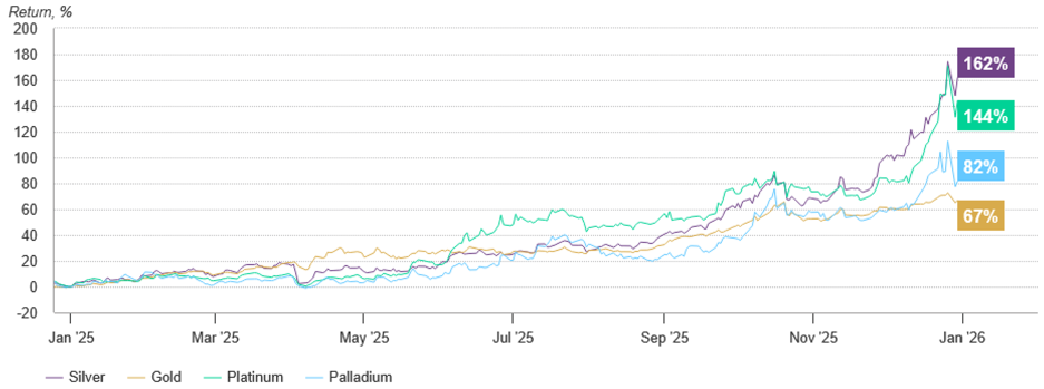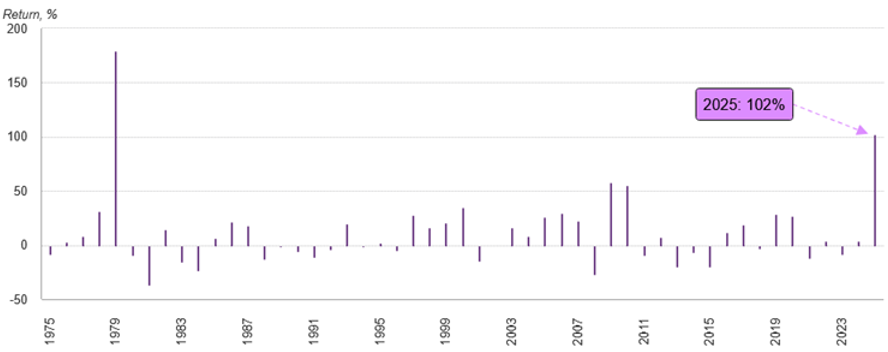 Silber schaltete 2025 in den Turbo-Modus: Ein Anstieg von rund 162 % (laut WGC‑Grafik) – und damit ein Lehrstück darüber, wie schnell ein vermeintlich „kleiner“ Markt kippen kann. Silber ist gleichzeitig Geldmetall und Industriemetall – wenn der Markt physisch wird, wird es eng, und Preise werden plötzlich zur Schlagzeile.