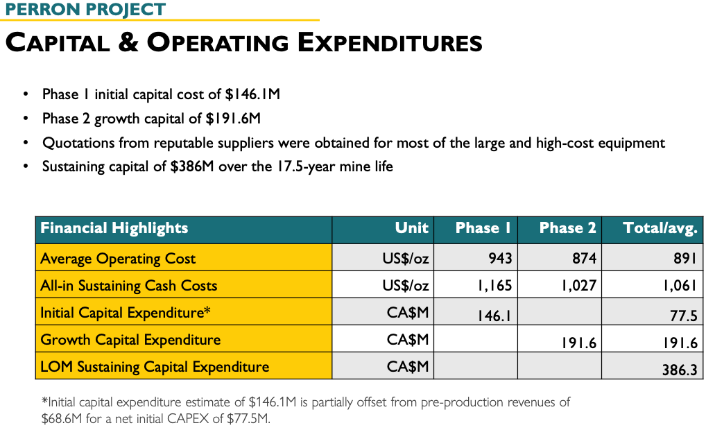 Der Clou ist das 2-Phasen-Design: ~4 Jahre Toll-Milling (CAPEX-niedrig, Cashflow-früh) vor dem On-Site-Plant-Ausbau. Eine Architektur, die Verwässerung dämpfen und Ausführungsrisiken senken kann. Für die ersten zehn Jahre modelliert die Studie durchschnittlich ~112.000 oz/Jahr. Genau diese Kapital-Effizienz pro investiertem Dollar positioniert Perron im High-Margin-Quadranten der Peer-Landschaft.