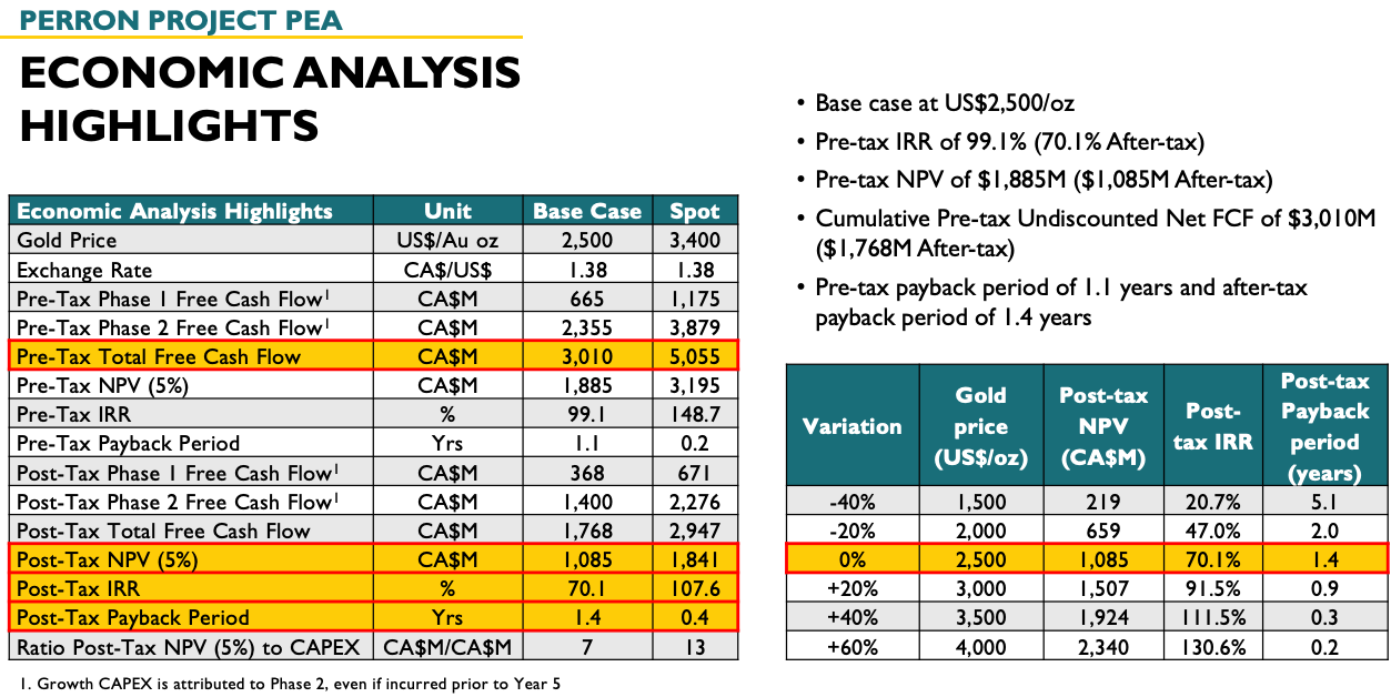 Amex Exploration (WKN: A2DJY1) sein Perron-Projekt in Québec verbindet Grad-Qualität mit messbarer Ökonomie und pragmatischem Hochlauf – exakt das Profil, das Betreiber in einem Gold-Bullenmarkt priorisieren. Die aktualisierte PEA (4. Sept. 2025) zeigt einen Vorsteuer IRR von 70,1 % und NPV5 % von 1,085 Mrd. CAD, wohlbemerkt bei einem Goldpreis von nur 2.500 USD/oz!!! Schauen Sie sich diese ohnehin schon gigantischen Zahlen bei einem Spot-Preis von noch immer konservativen 4.000 USD pro Unze an, dann Reden wir von einem IRR von fast 131 %!