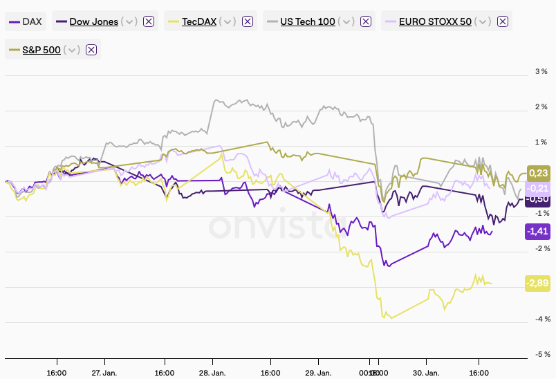 Stotter-Start in die Berichtssaison! Schwächer aufgenommene Zahlen von Microsoft und SAP sorgten für Nervosität. Zwischenzeitliche Rekorde in den USA verpufften, Europa geriet in den Schlussauktionen unter Druck.