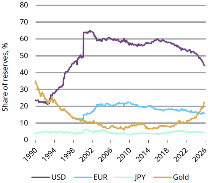 Gold ist wieder am Kommen: Gold, US-Dollar, Euro, Yen-Forderungen als Anteil der offiziellen Devisenreserven (Stand: 31. Dezember 2025):