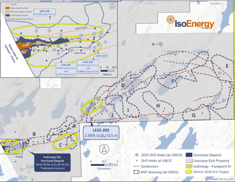 IsoEnergy (WKN: A412Q0) plant rund 5.200 Meter Diamantbohrungen, aufgeteilt auf bis zu 13 strategisch platzierte Bohrlöcher, die darauf abzielen, die Grenzen der bekannten Hurricane-Ressource signifikant zu erweitern. Besonders spannend ist, dass einige dieser Bohrziele sich bis zu drei Kilometer östlich des bekannten Trendverlaufs erstrecken, jenseits der bislang kartierten Gebiete. Hier könnten neue „Greenfield-Zonen“ mit Uran-Mineralisierung entdeckt werden, was die Geologie des gesamten Gebiets nachhaltig verändern würde.