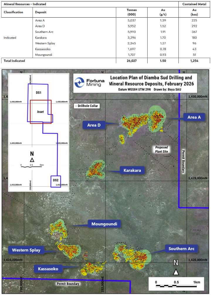 Am 19. Februar 2026 veröffentlichte Fortuna eine deutlich angehobene Mineralressourcenschätzung für Diamba Sud. Die angezeigten Ressourcen stiegen auf 26,0 Mio. Tonnen mit durchschnittlich 1,50 g/t Gold beziehungsweise auf 1,254 Mio. Unzen Gold. Das entspricht gegenüber dem vorherigen Stand einem deutlichen Zuwachs und verleiht dem Projekt größere Substanz.