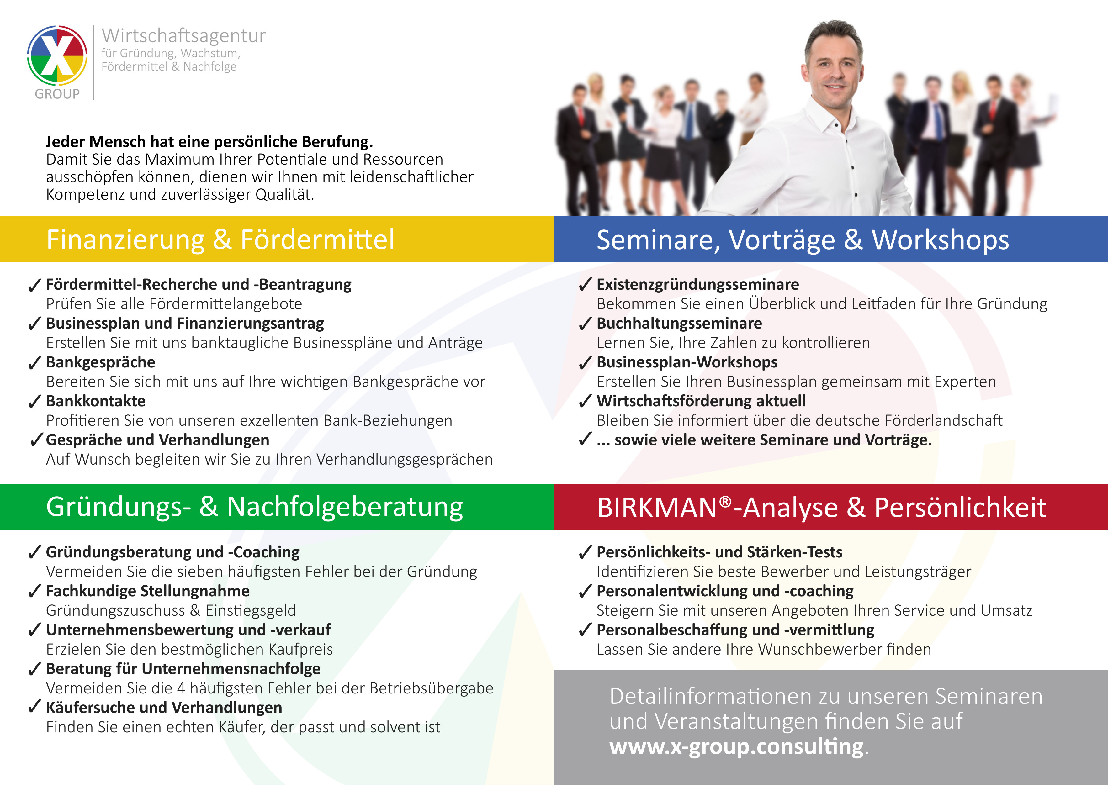 Die Berliner x-group GmbH ist Ihre Wirtschaftsagentur für Gründung, Wachstum, Fördermittel & Nachfolge. Als KfW-gelistete und BAFA-zugelassene und zertifizierte Fachberater unterstützen wir Gründer bei der Business-Plan-Erstellung und Beantragung von Fördermitteln. Etablierten Unternehmern helfen wir mit Rentabilitätssteigerung, Projektfinanzierungen sowie Nachfolgeberatung und –begleitung. Businessplan, Gründungsberatung, Fördermittel, Bankgespräche? Wir beraten, helfen, begleiten Sie von der Gründung bis zur Nachfolge mit professionellen Coaches, damit Sie erfolgreich werden. Unser Motto: Mehr Freude am Unternehmen.